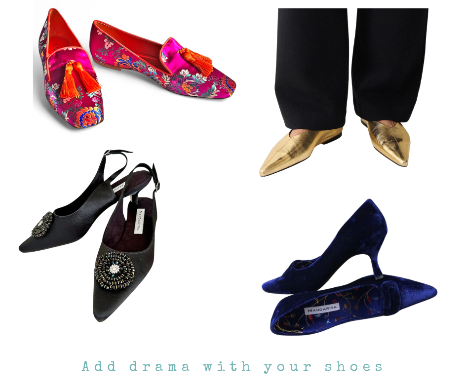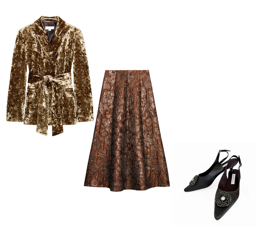 A satin or velvet blouse in your best jewel tone + tailored black trousers + kitten heels.